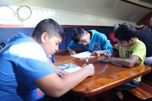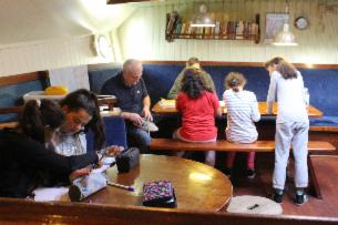MIt jedem Tag wuchs die Gruppe zusammen. Vor allem beim Ablegen,Segelsetzen,Wenden, Halsen, Segeleinholen und Anlegen zeigte es sich, wie gut die Crew sich gegenseitig unterstützte. Aber auch unter Deck war die Stimmung fröhlich, selbst das Schreiben der Berichte gelang gut.