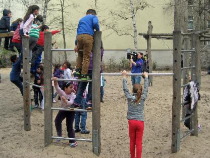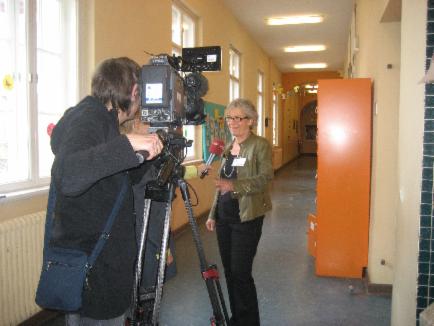 Auf ihrem Weg zur Lernwerkstatt sprachen die Gäste auf dem Schulhof mit vielen Kindern. Das Team der rbb- Abendschau begleitete sie dabei.