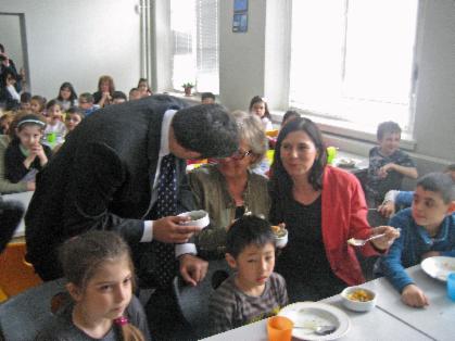 In der Mensa bekamen die Gäste eine kleine Stärkung. Sie probierten am Tisch mit den Kindern der Schulanfangsphase die Gemüsesuppe.